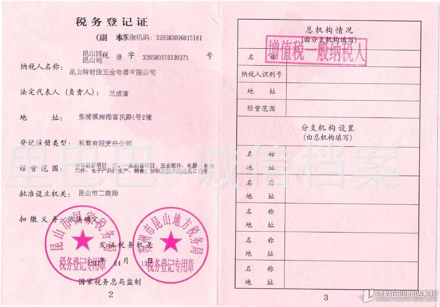 2、稅務(wù)登記證副本(加蓋增值稅一般納稅人印章)