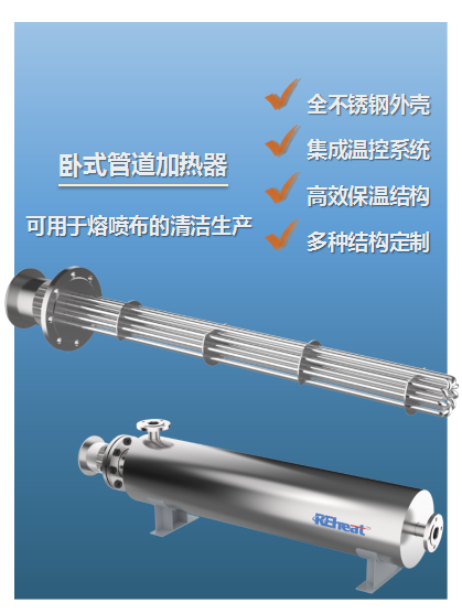 熔噴工藝需用大量的熱空氣。空壓機輸出的壓縮空氣經(jīng)除濕過濾后輸送到空氣加熱器加熱,然后再送至熔噴模頭組合件??諝饧訜崞魇菈毫θ萜?,同時要抵抗高溫空氣的氧化作用,因此材料必須選用不銹鋼。 空氣加熱器的發(fā)熱元件為不銹鋼電加熱管。加熱器內(nèi)腔設(shè)置多個折流板,可延長空氣在加熱器內(nèi)腔滯留時間,以提高熱交換效率。適當(dāng)增加加熱管數(shù)量,提高空氣加熱器的裝機功率,可縮短生產(chǎn)線開車升溫時間。熔噴工藝對牽伸空氣加熱器的溫度控制精度要求較高,牽伸空氣溫度要求穩(wěn)定在±1℃的范圍內(nèi)。